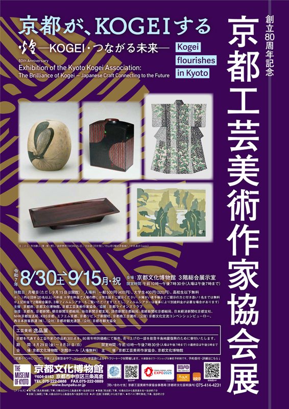 京都工芸美術作家協会は、京都を中心に活躍する工芸美術作家の会派を超えた作家団体として、染織、陶芸、漆芸、金工、人形、ガラス、木竹、七宝など、多岐にわたる分野の作家が参加し、昭和21年に設立。